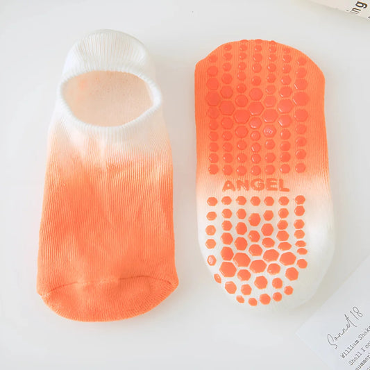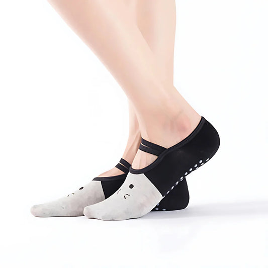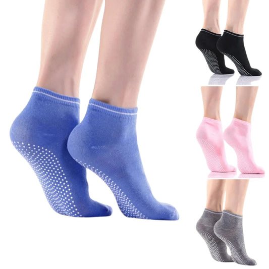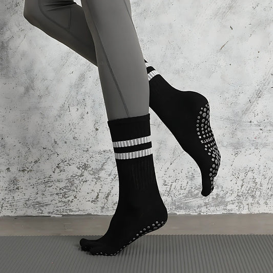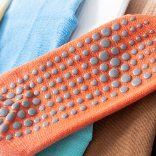 Silicone or rubber grip dots on sock soles prevent slipping. The dots activate traction on yoga mats and studio floors. Grip socks yoga stay put during balance poses and transitions. Slip-resistant points work on smooth surfaces during sweaty practice. The dots add grip without bulk of shoe soles. Barefoot connection stays intact while preventing dangerous slipping.