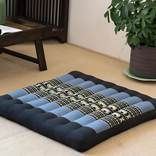 Square zabuton mats measure 40-50cm across and 5-6cm thick. They cushion hard floors under sitting bones. Ankles and knees press into soft padding. This stops pain during long seated stillness. Plush fabric feels gentle on bare skin.