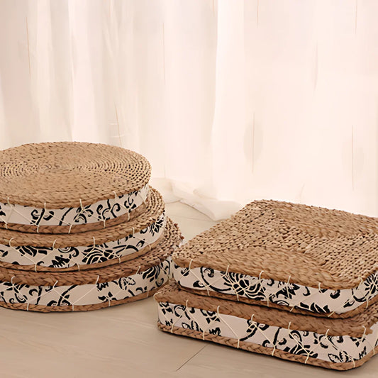 Floor poufs measure 40-60cm wide and 5-10cm thick. Natural straw, rattan, or papyrus construction breathes well. Handwoven by artisans using traditional methods passed down. Memory foam inserts add soft cushioning under sitting bones.