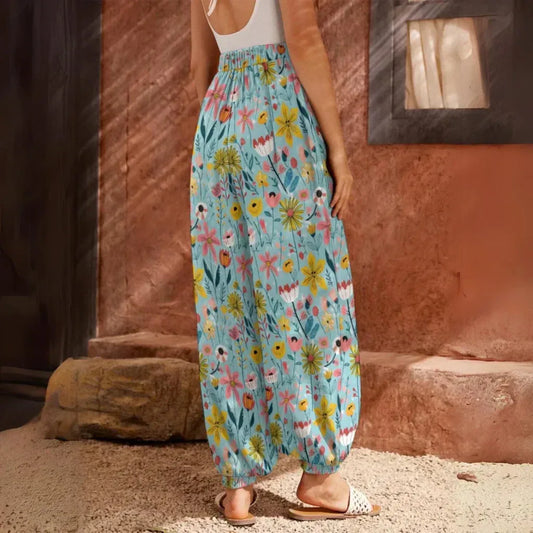 Bohemian Harem Pants In Soft Blue Floral Doodle